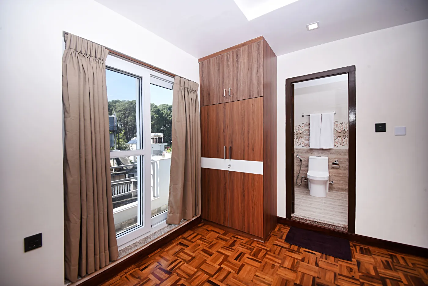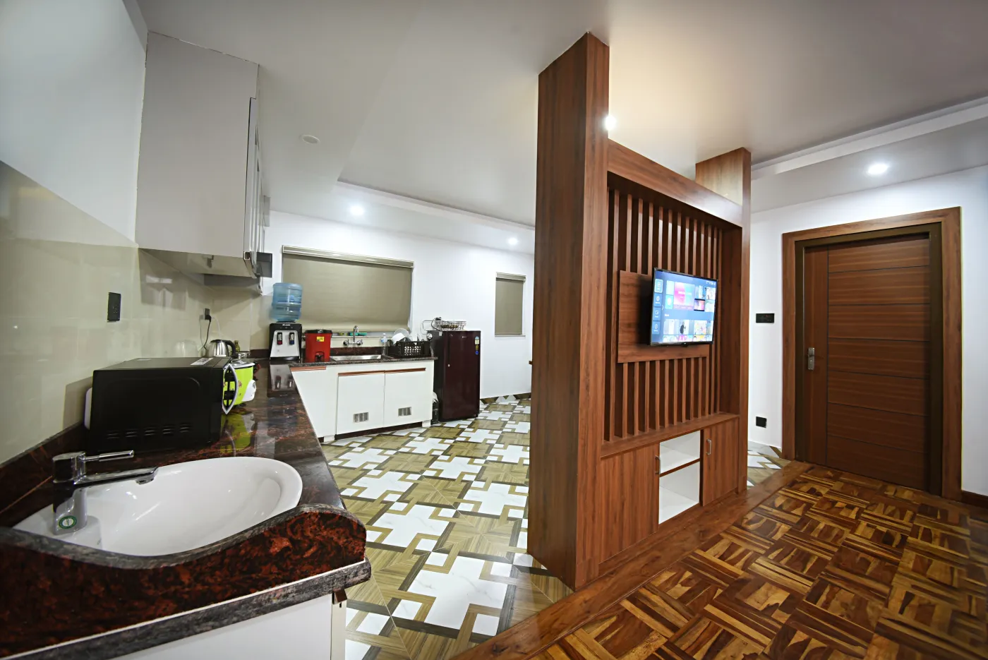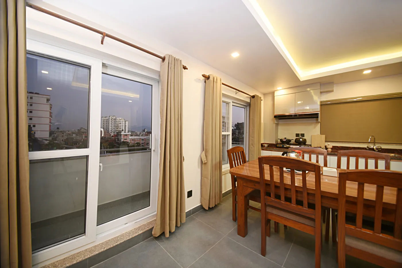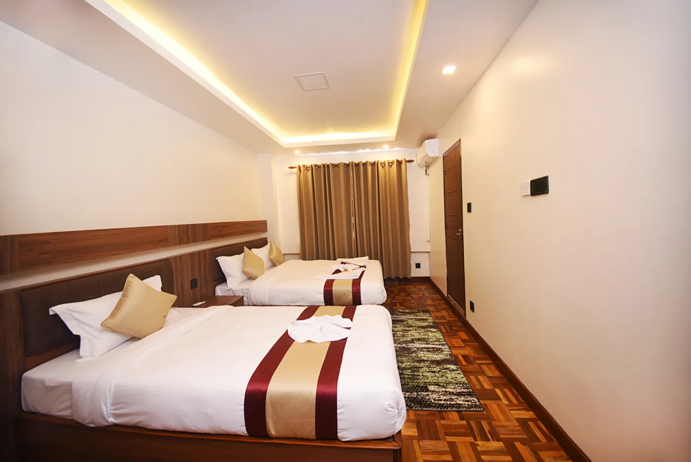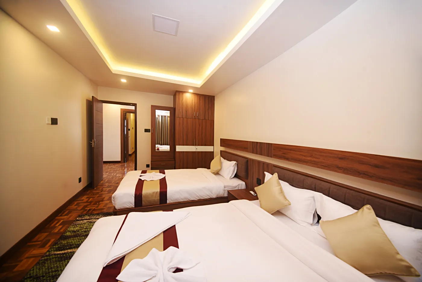Perfect for large families or groups, this spacious 3BHK apartment features three private bedrooms, four modern bathrooms, and a large living room with two sofa beds. Each bedroom includes a king-size bed and additional twin beds for flexibility. Enjoy the private balcony with city views, a fully equipped kitchen, microwave, tea/coffee maker, flat-screen TV, free WiFi, and air-conditioning. Designed for comfort and convenience — your home away from home in Kathmandu.