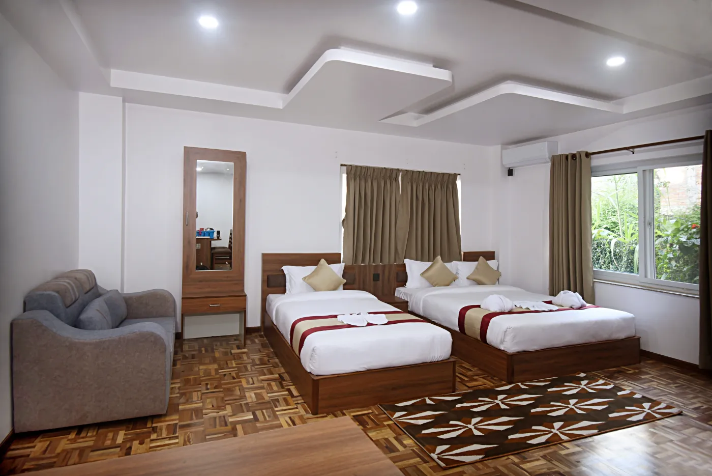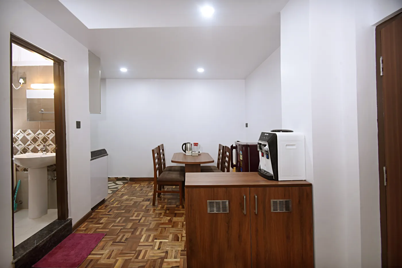 Elegant and modern, this suite offers a blend of luxury and homeliness. Comes with one king-size bed and one twin bed, private bathroom, flat-screen TV, microwave, and air-conditioning. Perfect for business travelers or short stays seeking a comfortable and peaceful environment.